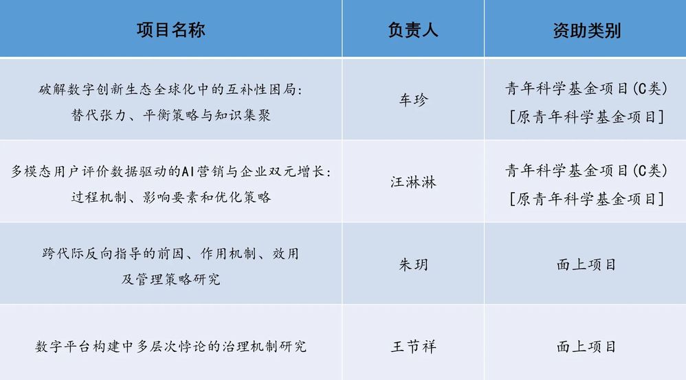 我院朱玥教授、王节祥教授获国家自然科学基金面上项目资助,汪淋淋老师、车珍老师获青年科学基金项目资助。