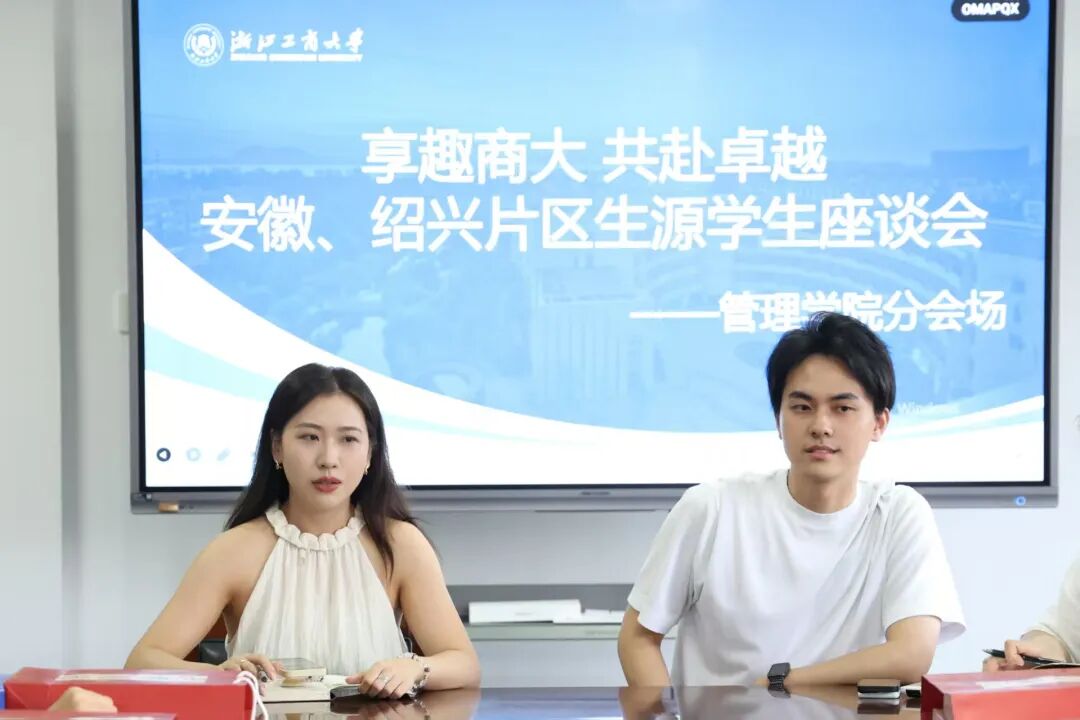 为进一步提高学校及学院的招生影响力和生源质量,2025年9月28日,工商管理学院(MBA学院)在教工路校区召开了“享趣商大 共赴卓越”安徽、绍兴片区生源学生座谈会。学院学生工作办公室主管赵咪妮、辅导员蒋海阳、陈利明及安徽、绍兴片区新生参加会议。