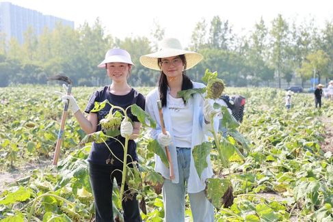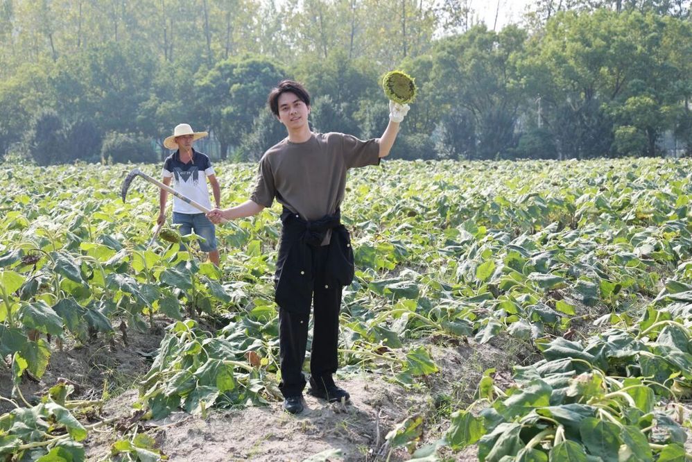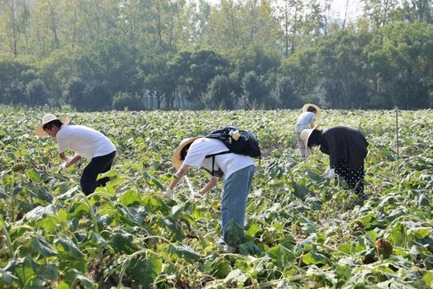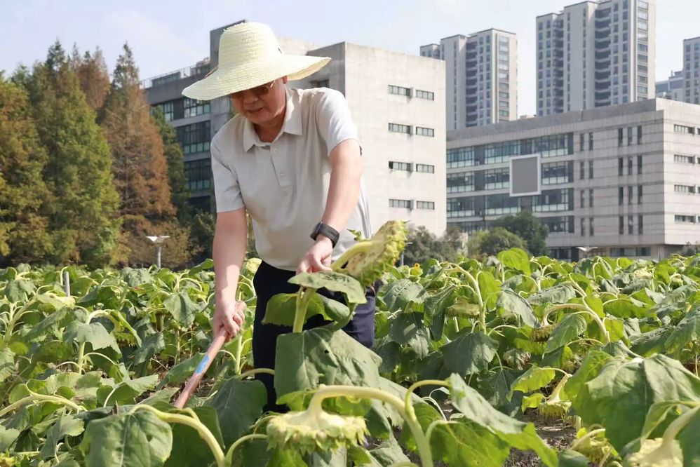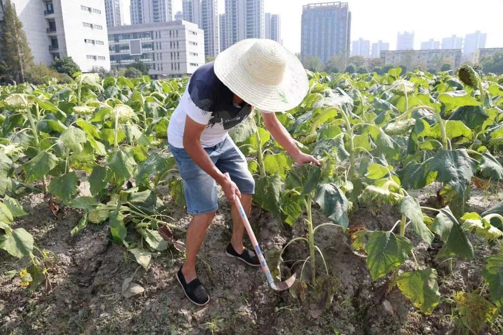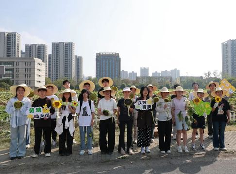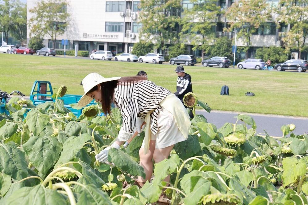 师生们头戴草帽,手持农具,躬身实践。当播种的种子成长为沉甸甸的花盘,当课本中的“劳动”二字化为掌心的泥土与饱满的籽粒——所有的付出与等待,在此刻具象化。大家分工有序,或采收、或搬运、或整理,彼此间默契配合,笑语声声,整片花田洋溢着丰收的喜悦。
