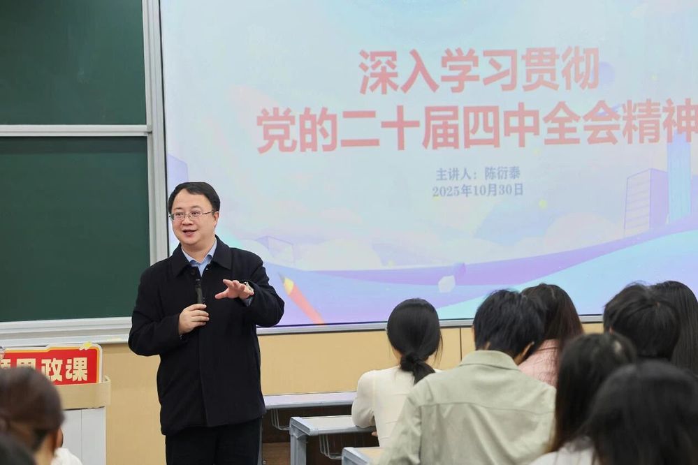 课上,陈衍泰副校长系统介绍和解读了党的二十届四中全会精神。他结合个人对国家经济社会发展的相关研究,围绕“十四五”规划的实施成效、经验启示以及“十五五”时期的初步展望三个方面展开讲解,重点阐述了“十四五”时期我国在科技创新、法治进步、文化事业、民生保障与生态环境保护等方面取得的显著成就。他引导同学们深入思考,理解坚持党的领导、坚持以人民为中心、贯彻新发展理念、深化改革开放和注重系统谋划对国家发展的重要意义。
