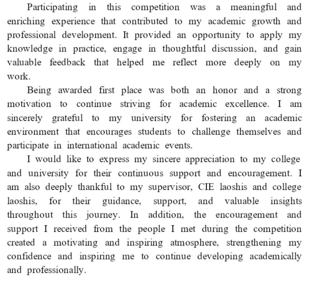 此次佳绩的取得,既是Zharykbassova Kamila同学学术能力与国际视野的精彩展现,也是学校、学院国际化办学理念与人才培养成效的有力印证。学院将以此为契机,继续深化来华留学教育管理工作,鼓励更多学子参与全球性对话,在文明互鉴中提升素养,在实践探索中贡献智慧,共同为守护人类共有的河流家园、推动可持续发展谱写新的篇章。