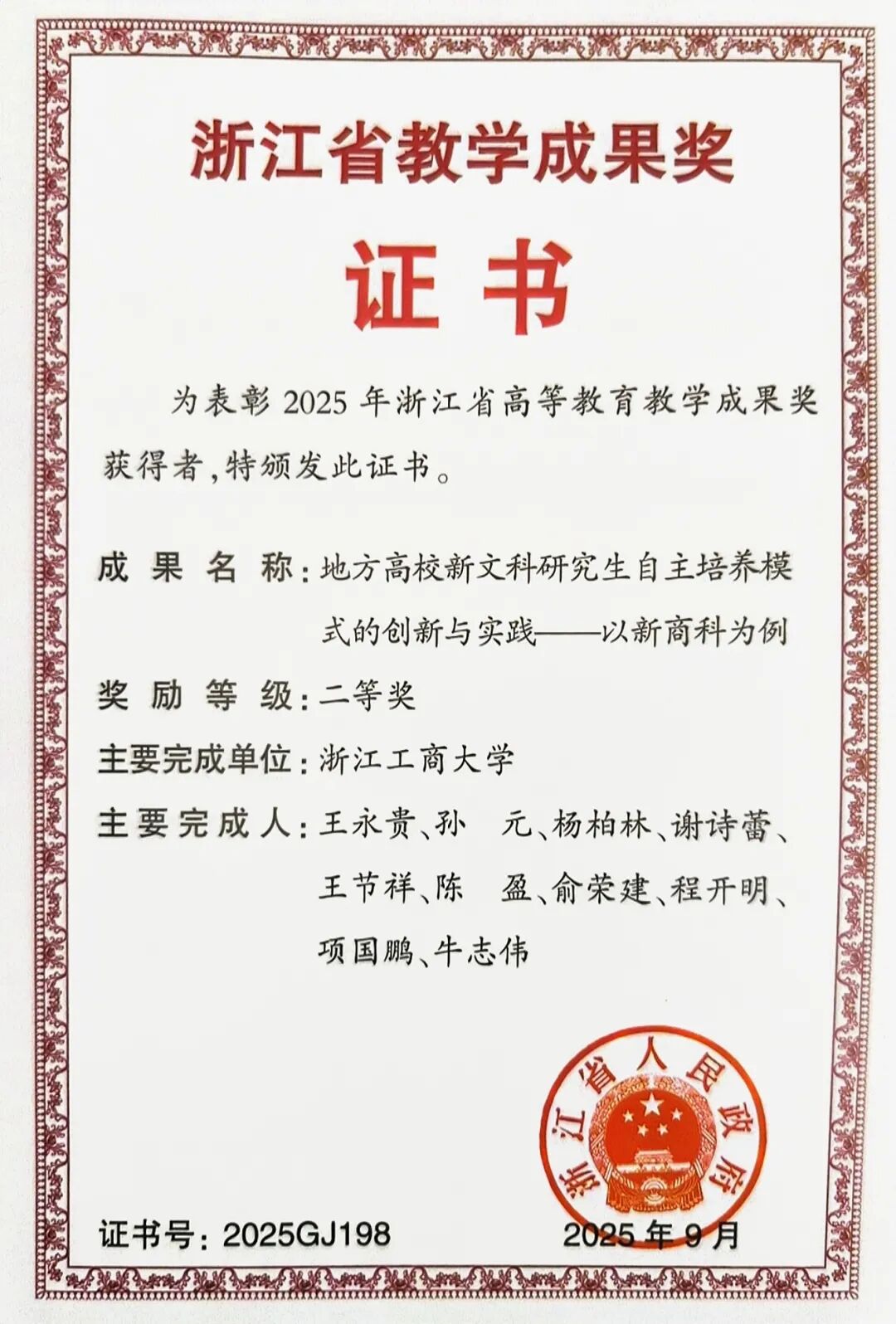 由王永贵校长牵头申报的《地方高校新文科研究生自主培养模式的创新与实践——以新商科为例》教学成果,荣获浙江省高等教育教学成果奖二等奖,标志着学院在构建特色鲜明、成效显著的新文科研究生自主培养模式上取得了重要阶段性突破。