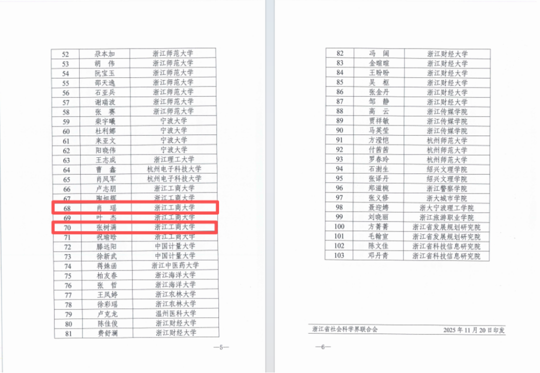 2025年我院肖瑶、张树满两位老师入选第七批浙江省“之江青年社科学者行动计划”。