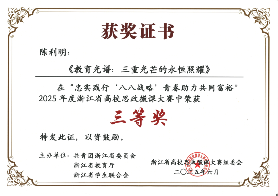 以创新思政形式与载体强化理论武装,取得系列标志性成果:研究生李雨睿获浙江省高校思政微课大赛学生组特等奖,辅导员陈利明获校赛特等奖、省赛三等奖;学院团委获评校五四红旗团委,学生会获评校级优秀学生会;学工队伍立项教育部及厅级课题各1项。