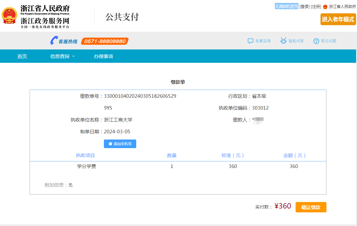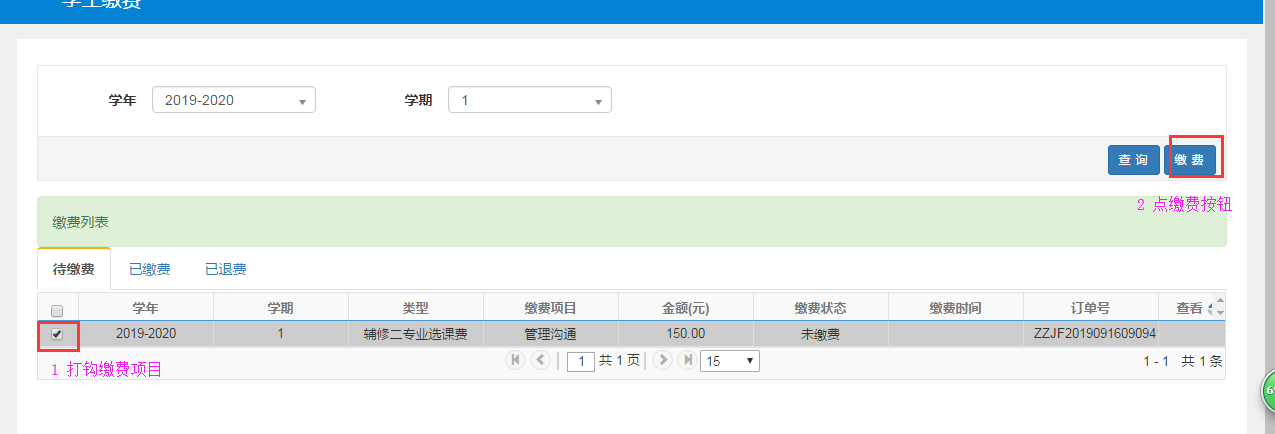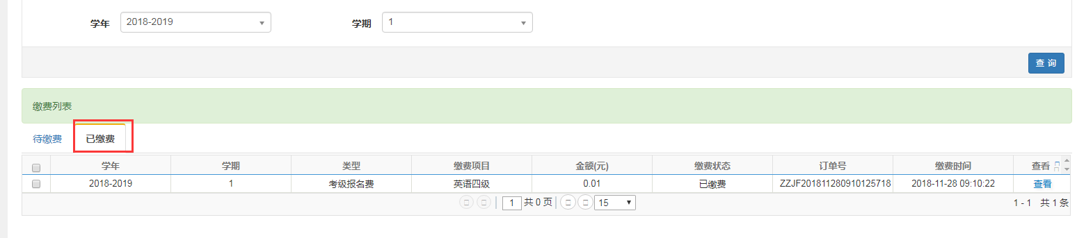 支付成功后,返回学生缴费界面,(请等待支付成功返回到以下界面再关掉窗口)刷新页面后,如下图所示。