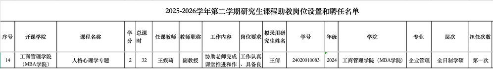 根据校研究生院“关于研究生申请担任2025-2026学年第二学期助教岗位的通知”要求, 现将“2025-2026学年第二学期研究生课程助教岗位拟录用研究生”公示如下。 公示时间为:2026年3月13日—2026年3月20日。如有异议,请在公示期内反馈,联系电话:89995929,邮箱:zzt@mail.zjgsu.edu.cn。