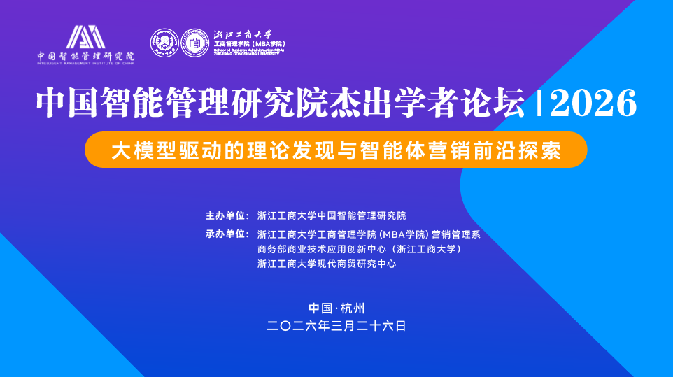 由浙江工商大学中国智能管理研究院主办,浙江工商大学工商管理学院营销管理理系、商务部商业技术创新应用中心(浙江工商大学)、浙江工商大学现代商贸研究中心承办的中国智能管理研究院杰出学者论坛将于2026年3月26日上午9:00-11:00在浙江工商大学下沙校区国际会议中心一楼进行。