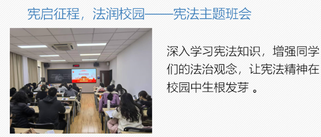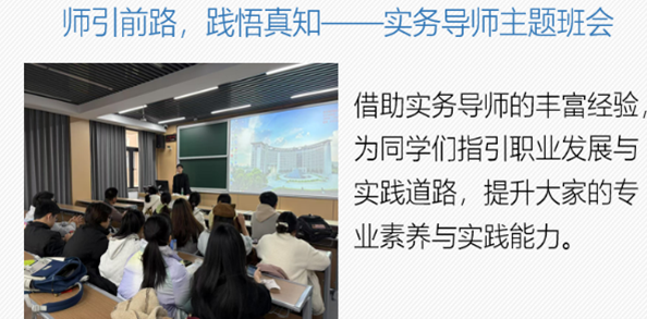 围绕主题教育实践开展系列活动:一方面通过观看微电影、实况短片,学习英雄榜样,让同学们感受国之强大;另一方面还举办宪法主题班会深化法治观念、期末主题班会助力冲刺备考、红色基因传承主题团日激发担当精神,以及依托实务导师经验的班会,为同学们指明职业方向、提升专业与实践能力。导师丰富经验,为同学们指明职业发展与实践方向,有效提升专业素养与实践能力。