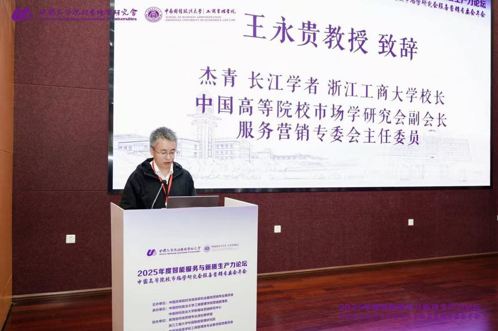 10月25日,中国高等院校市场学研究会服务营销专委会2025年度年会暨智能服务与新质生产力论坛在中南财经政法大学顺利召开。浙江工商大学工商管理学科带头人、教育部高校哲学社会科学自主知识体系建设战略咨询委员会委员、国家杰青、长江学者、浙江工商大学校长王永贵教授出席本次会议并做开幕式致辞与主旨报告。