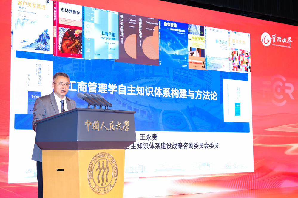 在大会主旨报告环节,王永贵教授系统阐述了工商管理学自主知识体系的构建路径。报告从“时代使命、政策引领、发展困境”三个层面深入分析了构建自主知识体系的必要性。他引用习近平总书记2022年4月25日在中国人民大学考察时的重要指示,强调要“加快构建中国特色哲学社会科学,归根结底是建构中国自主的知识体系”。