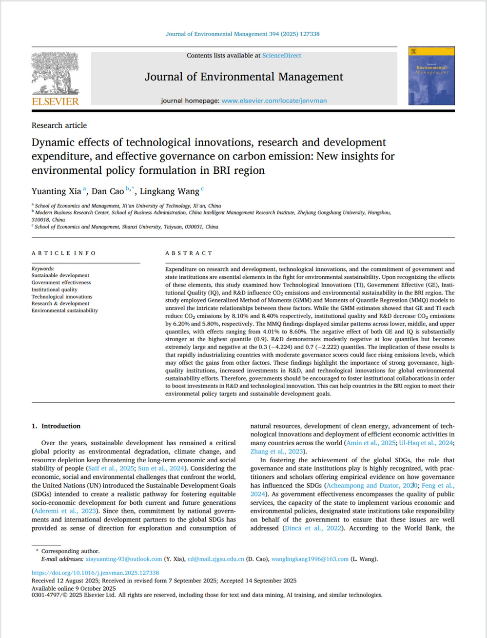 近日,浙江工商大学工商管理学院(MBA学院)教师曹丹作为唯一通讯作者发表的论文“Dynamic effects of technological innovations, research and development expenditure, and effective governance on carbon emission: New insights for environmental policy formulation in BRI region”刊发在Journal of Environmental Management。该期刊是国际知名期刊,SCI一区,ABS三星、中科院2区Top期刊, 2024年CiteScore为12.6。
