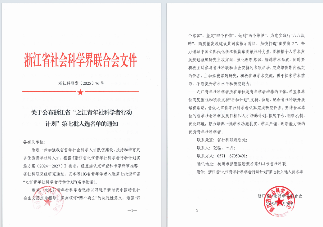2025年我院肖瑶、张树满两位老师入选第七批浙江省“之江青年社科学者行动计划”。