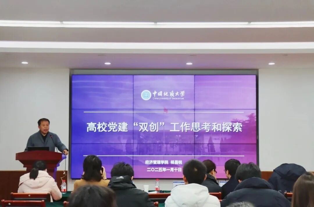 邀请中国地质大学(武汉)经济管理学院党委书记杨昌锐博士、教师党支部书记李江敏教授来学院开展题为“高校党建‘双创’工作的思考与探索”的讲座,学院党建中心团队、党支部书记参加讲座。数字创新与服务型制造研究中心党支部获评校“先进基层党组织”;人力资源本科生党支部获评校“优秀支部服务品牌”;张月月获评“最受师生喜爱的书记”提名奖;杨杰、张雨彤(学生)获评校“优秀共产党员”。