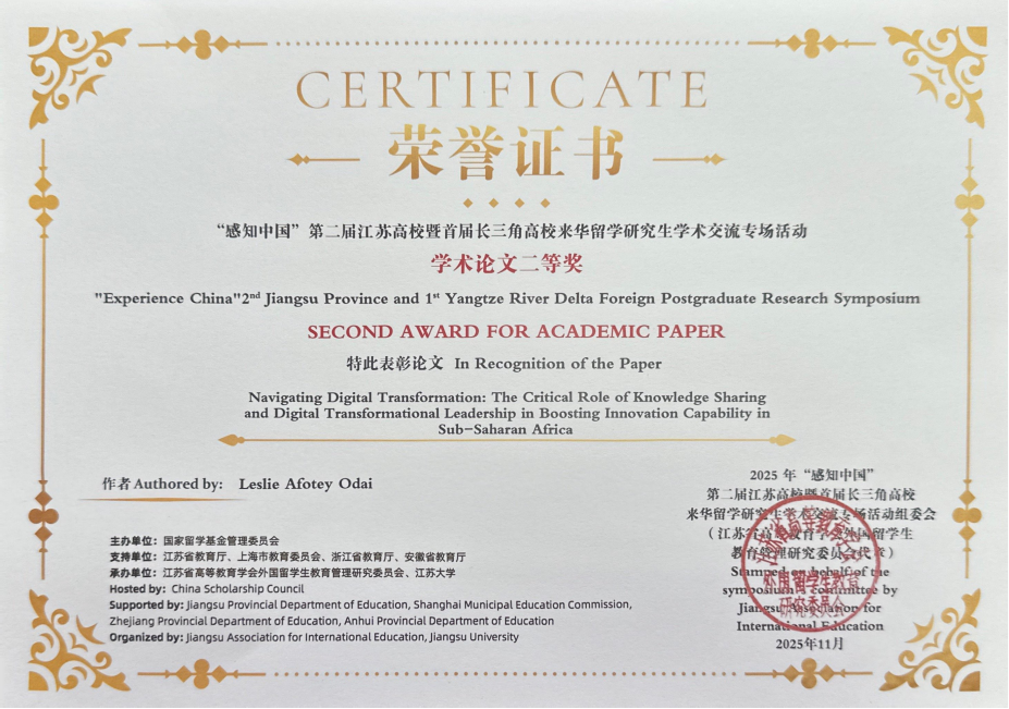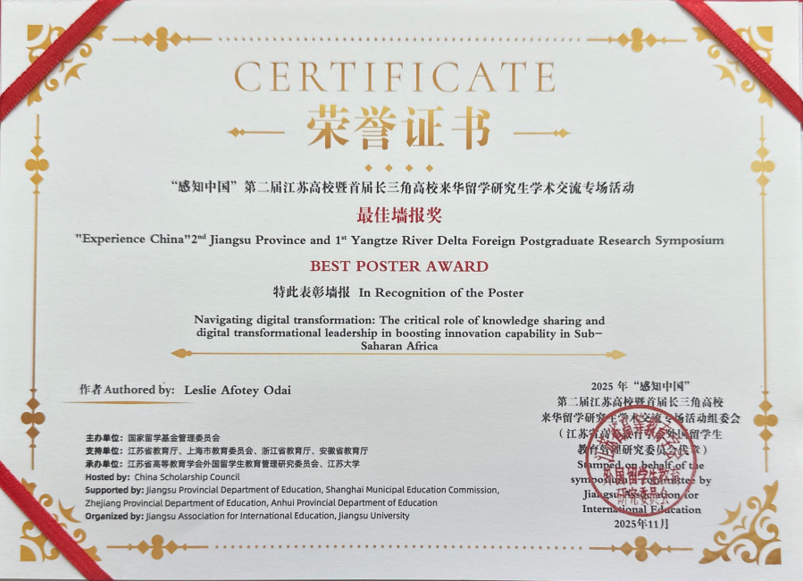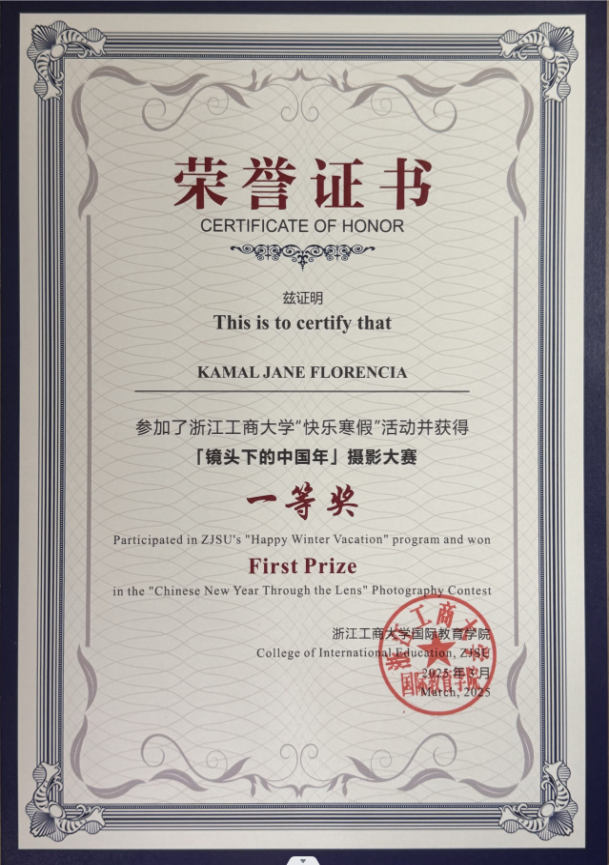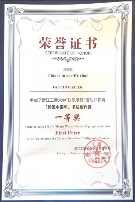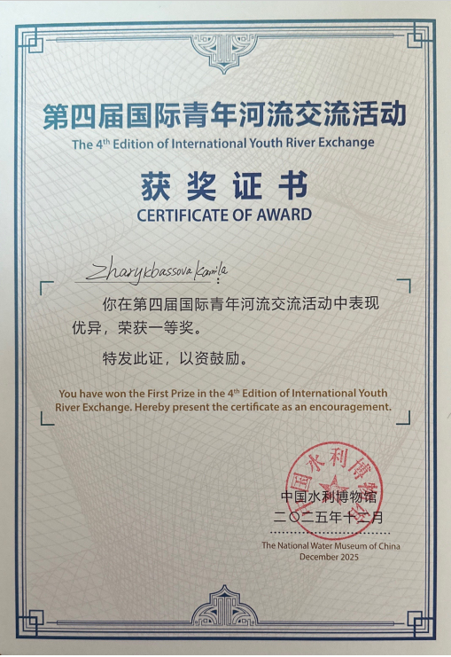 2025 级国际硕士生 Zharykbassova Kamila在 2025 年全国水利博物馆联盟会议暨第四届国际青年河流交流活动中荣获“一等奖”,并被授予 2025 年度“河流使者”称号;2022 级国际博士生 Odai Leslie Afotey在 2025 年“感知中国”第二届江苏高校暨首届长三角高校来华留学研究生学术交流专场活动中荣获“学术论文二等奖”和“最佳学术墙报奖”;2022 级国际本科生 Faith Ng Zu Er和 Kamal Jane Florencia分别在学校“快乐寒假”系列文化活动中获得书法创作赛和摄影大赛一等奖,充分展现了学院国际学生在学术研究与跨文化交流中的综合素养与良好风貌。