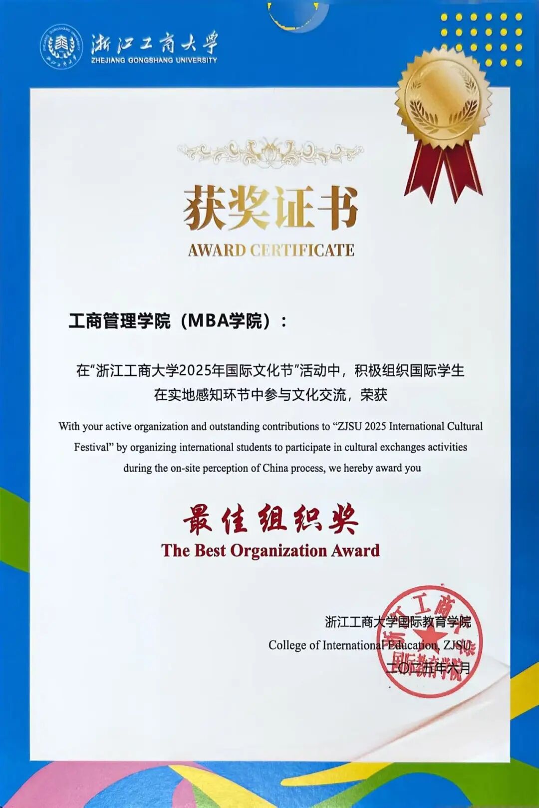 2025 年,学院国际学生培养成果丰硕,在浙江工商大学国际文化节中荣获“最佳组织奖”。国际学生在文体活动、学科竞赛等各类赛事中累计获得50 余项荣誉,学术表现持续提升,共发表 SSCI 及其他期刊论文 9 篇,其中 SSCI 论文 7 篇,高水平学术产出不断涌现。