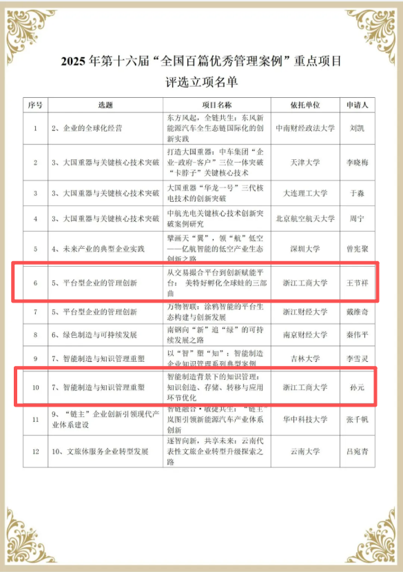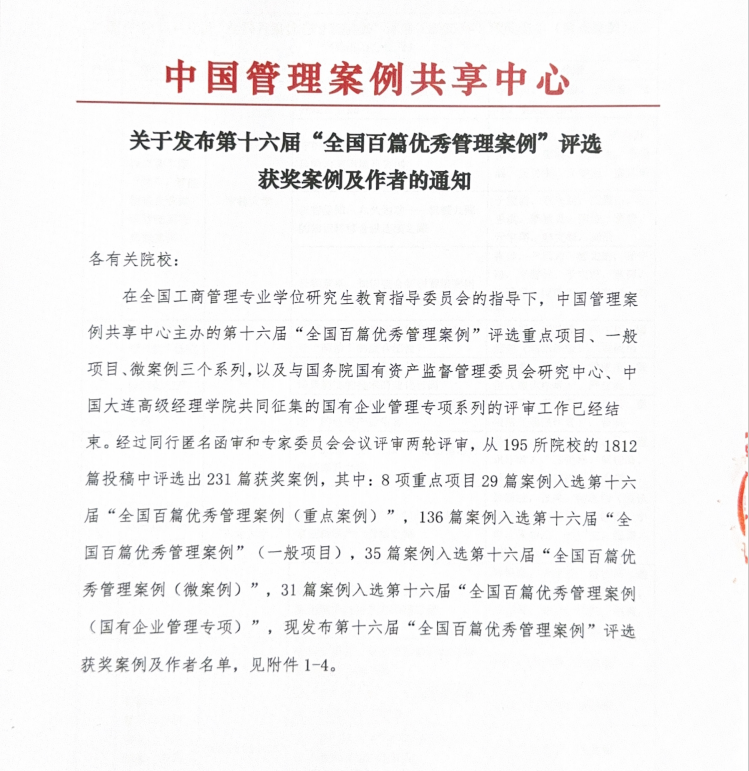 孙元教授和王节祥教授获第十六届“全国百篇优秀管理案例”重点项目立项,全国仅12项。