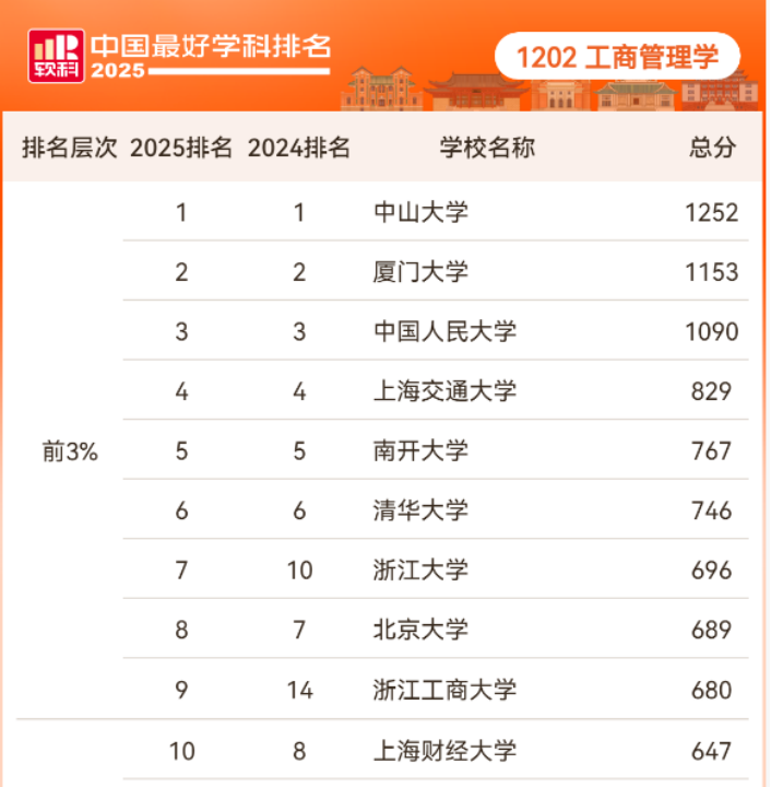 2025年软科中国最好学科排名中,浙江工商大学工商管理学科排名跃升至第9位,居全国前3%,首次入选“中国顶尖学科”。