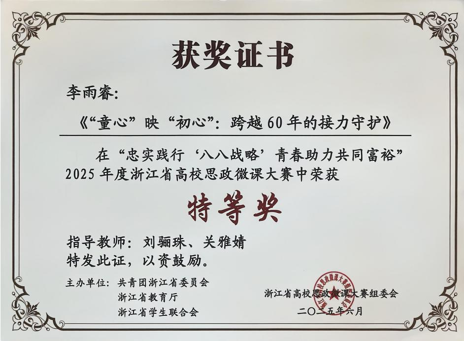 以创新思政形式与载体强化理论武装,取得系列标志性成果:研究生李雨睿获浙江省高校思政微课大赛学生组特等奖,辅导员陈利明获校赛特等奖、省赛三等奖;学院团委获评校五四红旗团委,学生会获评校级优秀学生会;学工队伍立项教育部及厅级课题各1项。