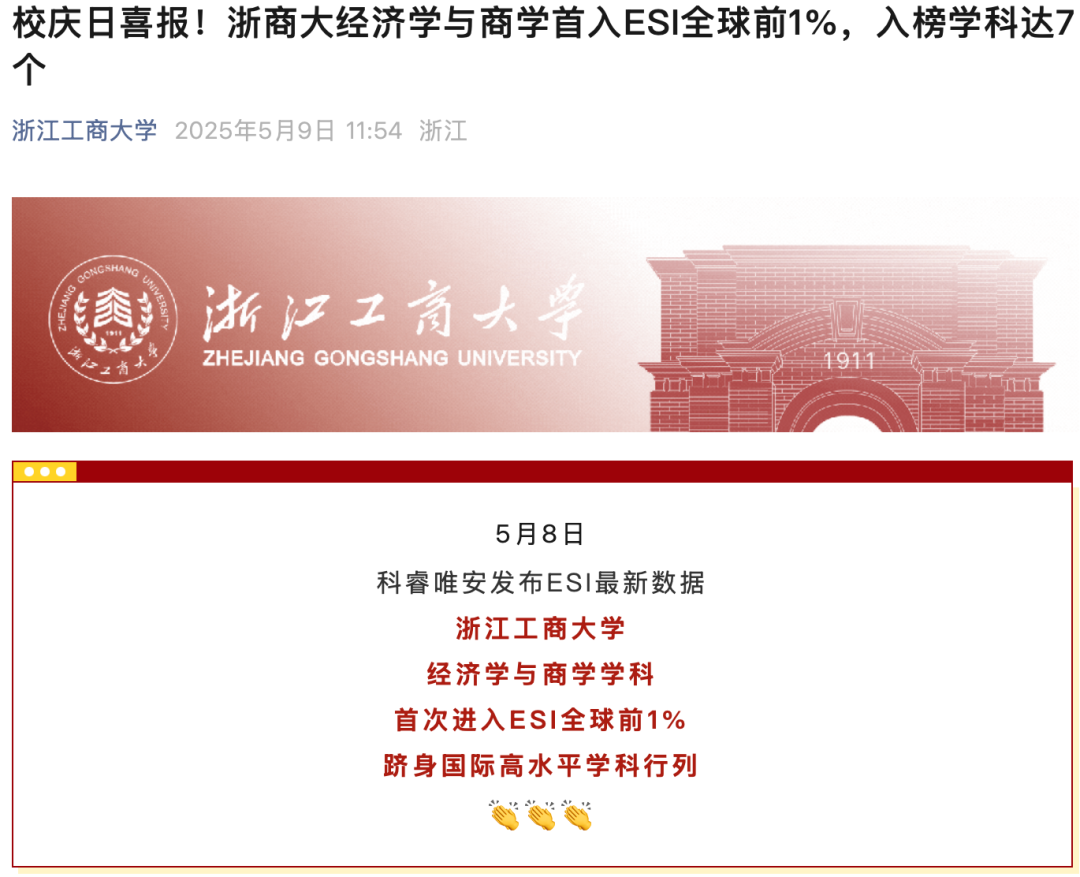 2025年,浙江工商大学经济学与商学学科(Economics & Business)首次进入ESI全球前1%。