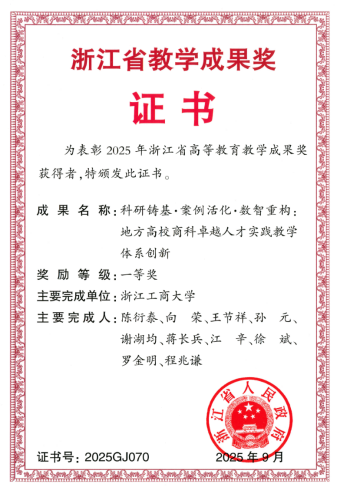 由陈衍泰副校长领衔完成的教学成果《科研铸基·案例活化·数智重构:地方高校商科卓越人才实践教学体系创新》荣获浙江省本科教学成果奖一等奖,系统展示了学院在“科研—案例—实践—数智”深度融合背景下推进本科实践教学体系创新的整体成效。