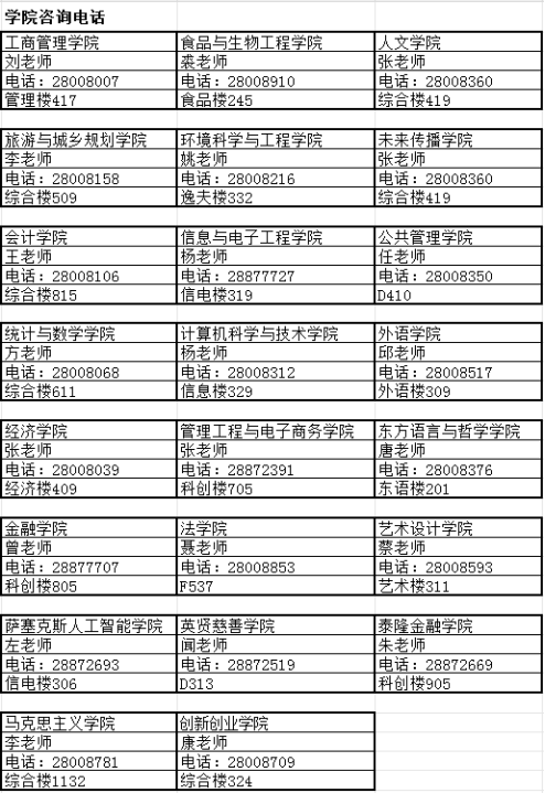 或双专业及辅修学院,学院联系人见下图。
